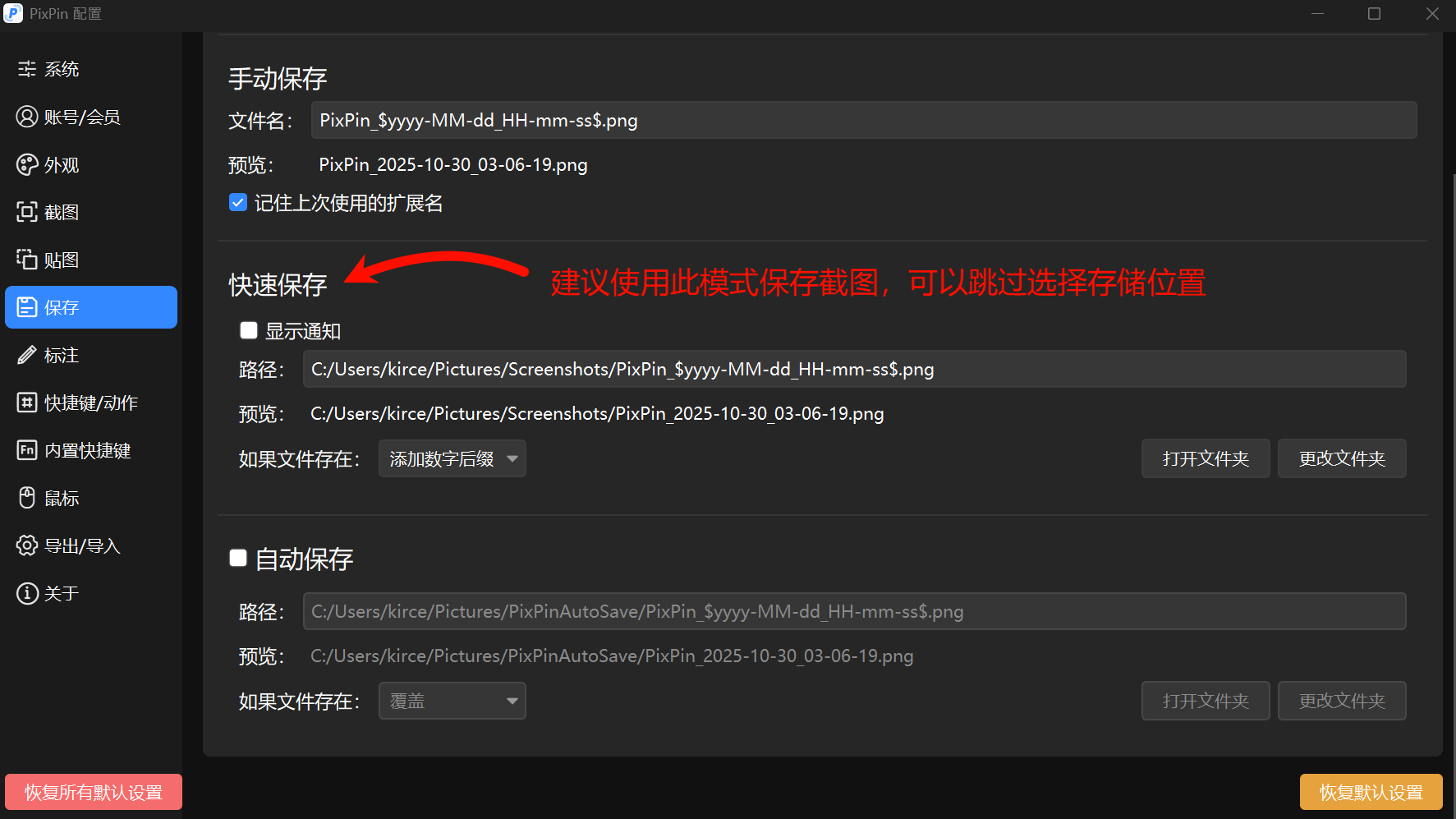 使用的时候我个人会习惯使用快速保存,具体设置如下。