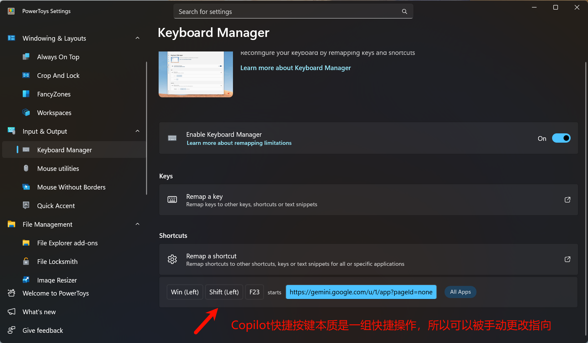 这个软件主要是用来进一步定制Windows各项功能的软件。比如,它可以在全局上把一些快捷键给重新映射到新的位置去。拿我自己的话,我就把Copilot给映射到了Google Gemini,这样每次按下去Gemini都会第一时间弹出来,而不是Microsoft自己的那Copilot软件。